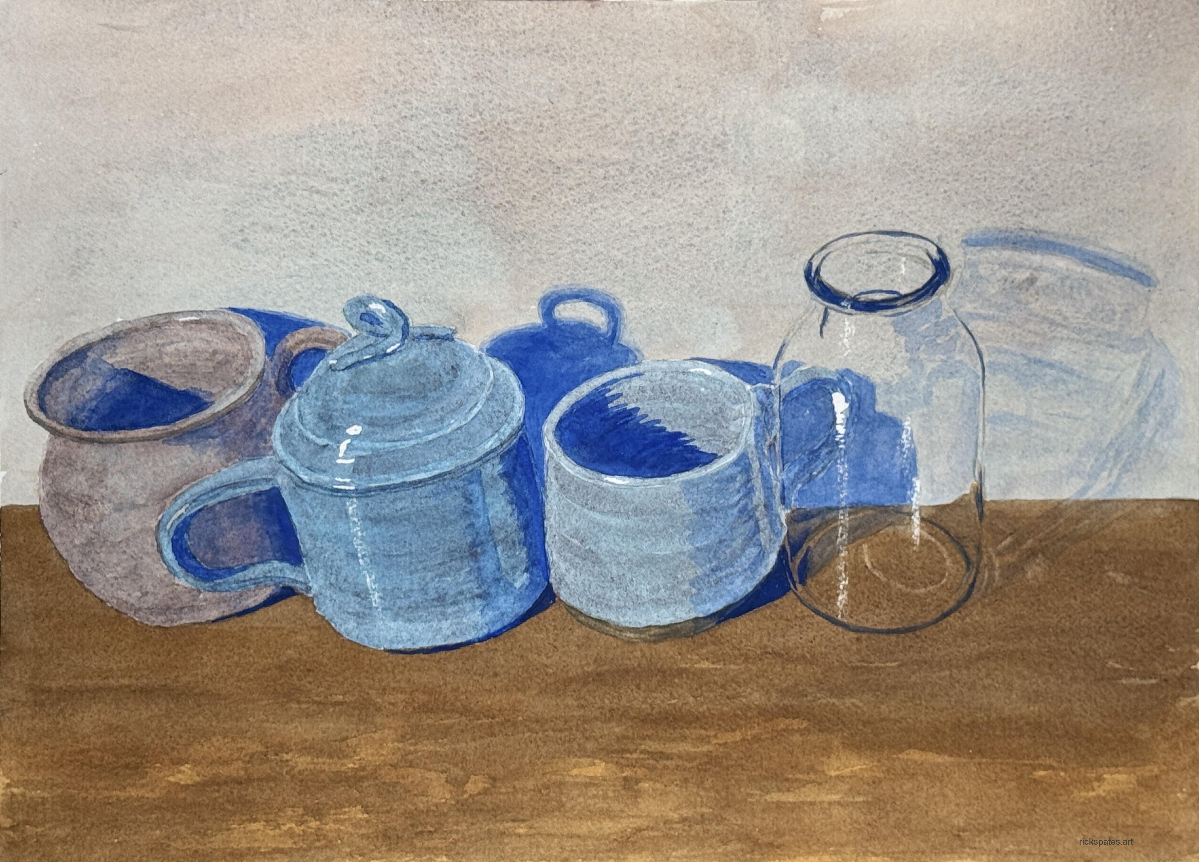 | description | A still life of three cups and a bottle. |